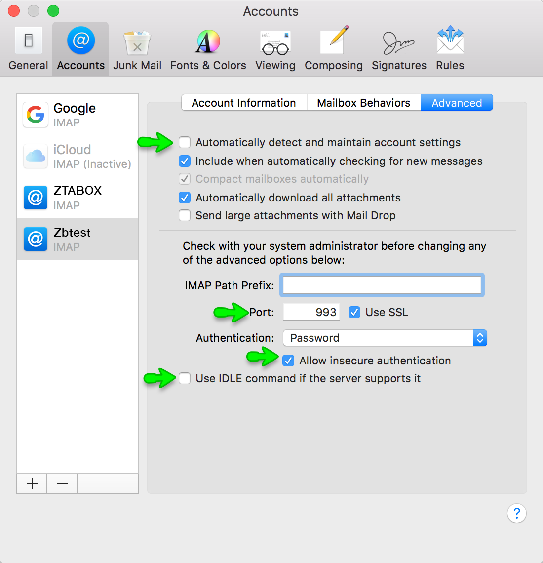 9. The next step is to verify Incoming mail server settings. In Accounts area of MacMail preferences, click on Advanced tab: