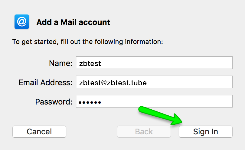 4. In Add a Mail Account window enter your full name, email address and email account password, then click on Sign In: