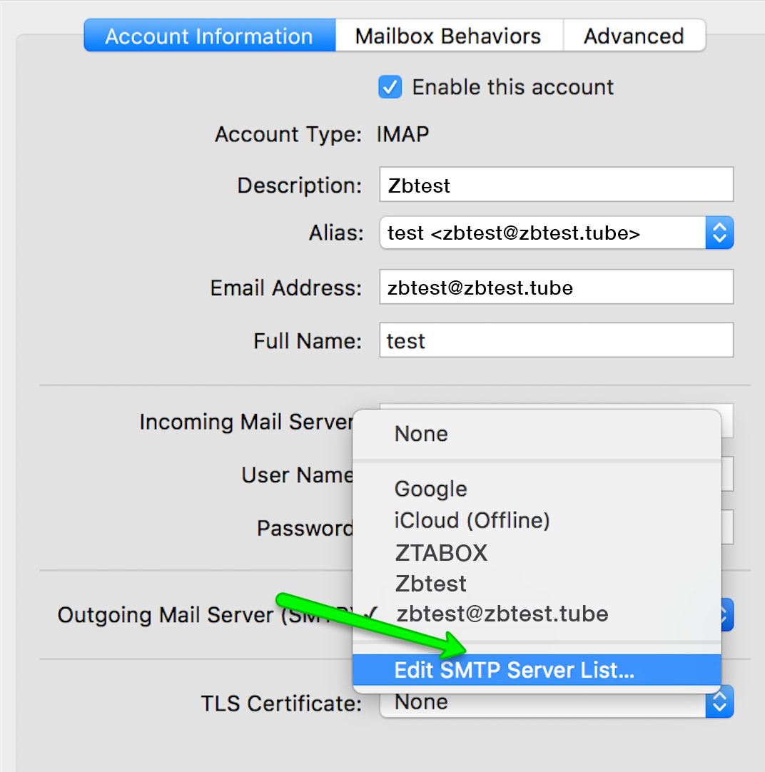 7. The next step is to verify that Outgoing Mail Server settings are correct. While on Accounts tab of Preferences window, click on a drop-down menu next to Outgoing Mail Server (SMTP) item on the list and choose Edit SMTP Server List... from the appearing menu: