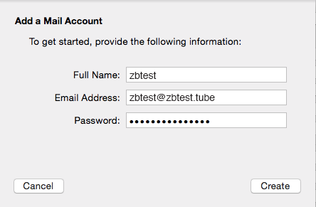 4. In Add a Mail Account window enter your full name, email address and email account password, then click on Create: