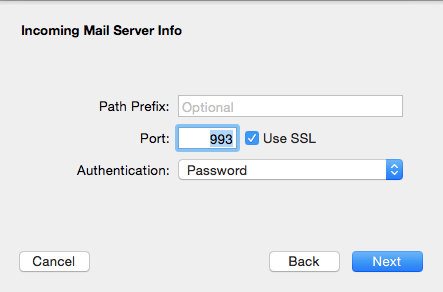 6. In the Incoming Mail Server screen select POP or IMAP protocol for Account Type, and enter your account details: