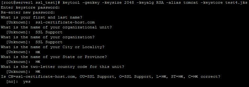 keytool -genkey -keysize 2048 -keyalg RSA -alias tomcat -keystore yourkeystore.jks -dname "CN=zbtest.tube, O=ZTABOX LIMITED, L=Hong Kong, ST=Hong Kong, C=HK, Street=Hong Kong"