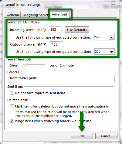7. Go to the Advanced tab and use the following ports and encryption based on the connection type you have chosen: