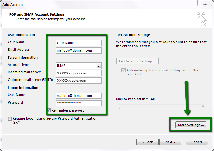 Outgoing email server: server your account is hosted on (looks like XXXXX.gopls.com)