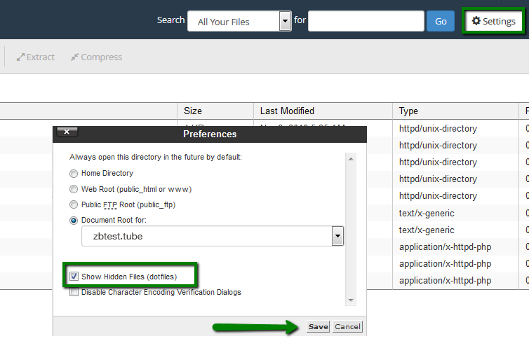 When you find the folder, the .htaccess file may already be there. To double-check it, click 'Settings' in the top-right corner and tick 'Show hidden files (dotfiles)'.