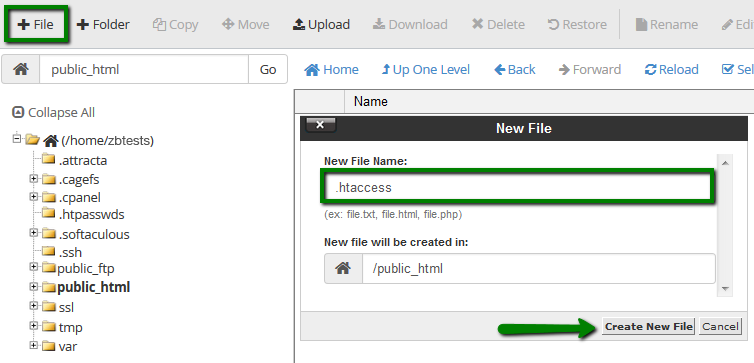 If the file did not appear, feel free to create it by clicking '+File'. Make sure to name the file '.htaccess', starting with the dot.
