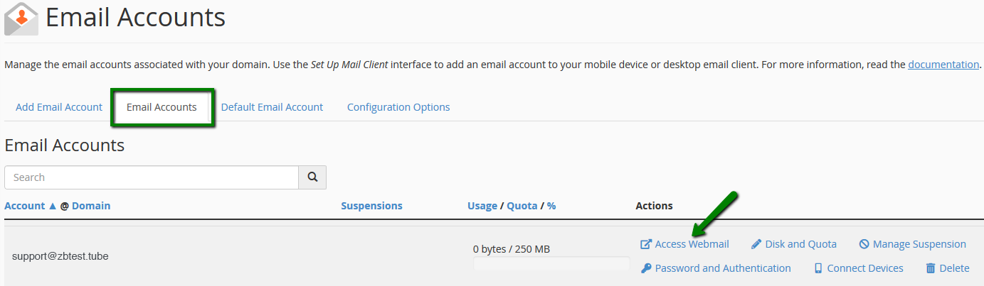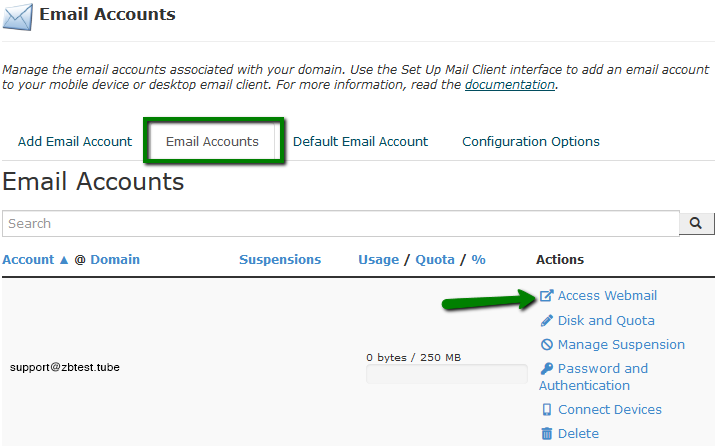 4. To log in webmail, click on Access Webmail next to the email account in question: