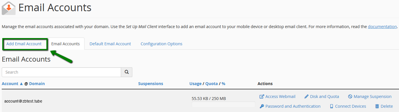 1. Log in to your cPanel >> Mail section >> Email Accounts menu: