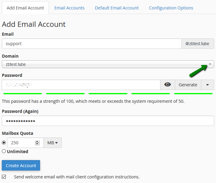 3. If you have multiple domains, select the domain you want your email account to be associated with in the drop-down list in the top right corner and enter the desired email. Make sure to enter a strong password of your choice twice: