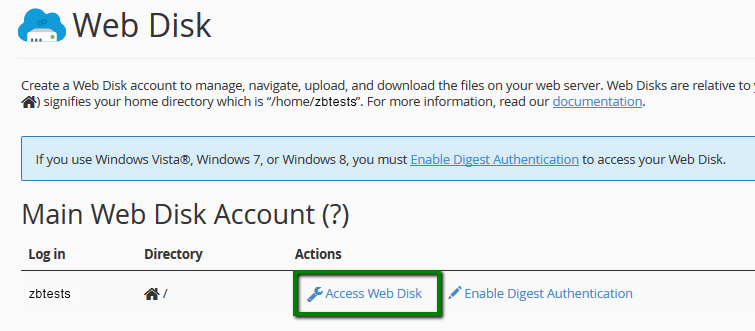 2. By default, the system creates a Web Disk account for your cPanel account. In order to access it, click the Access Web Disk button: