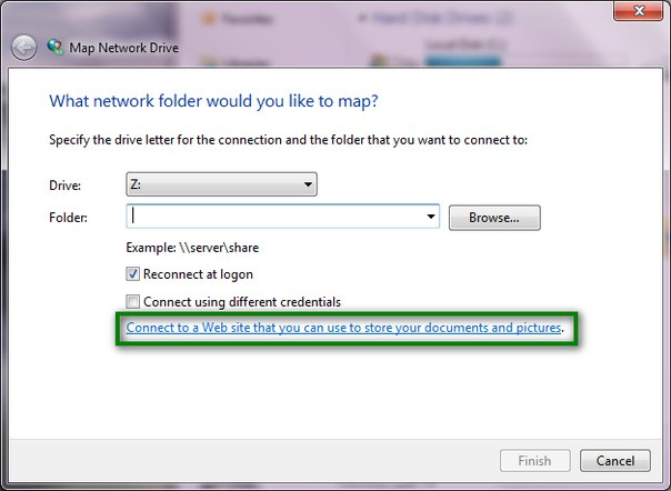 - click on Connect to a Web site that you can use to store your documents and pictures: