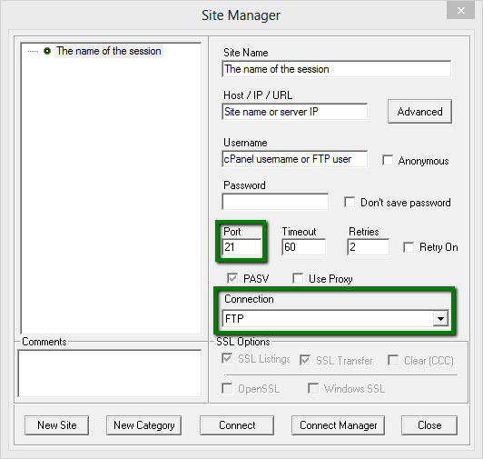 Extra attention should be paid to the port and connection protocol combination. Those can be set in the Port field and the Connection drop-down menu. The correct ones are: