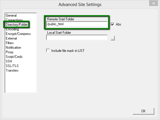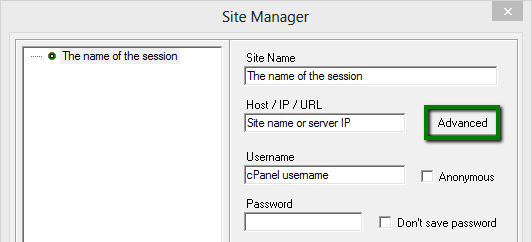 For setting up the starting folder of the FTP session when you use username, click on Advanced menu which is located in Site Manager window and then select Directory/Folder option from the left-side list.