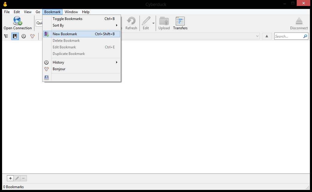 To set up a new FTP connection, you need to click the Bookmark menu from the top and choose the New Bookmark option. Also, for accessing a new bookmark's setup screen you may press Ctrl+Shift+B buttons (if you use MS Windows):