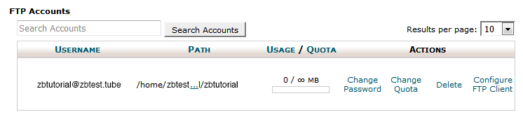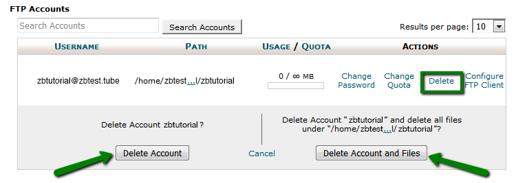 - Delete Account: remove the FTP account only. This will not remove the files that the FTP account's directory contains