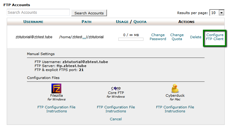 2. Click FTP Configuration File under the desired FTP client's logo. You can choose between Filezilla, CoreFTP, or Cyberduck