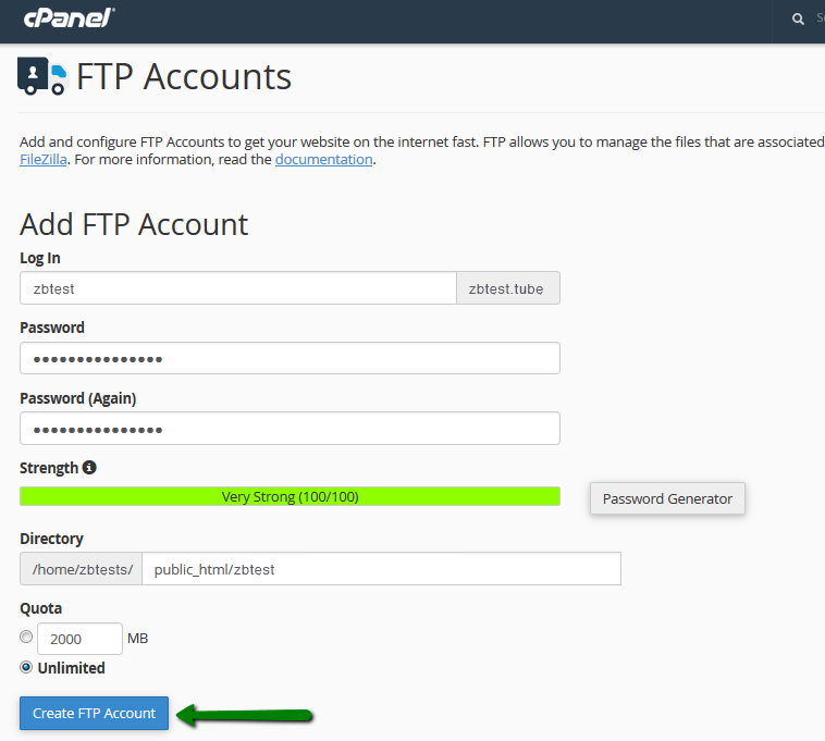- Directory: when you create an FTP account, it is limited to the directory you indicate here. cPanel will auto-fill an assumed directory based on the FTP username. You can erase everything after public_html/ and provide the directory you would like the user to access. You can also type a single / and the user will have access to your home directory (anything outside of the public_html folder).