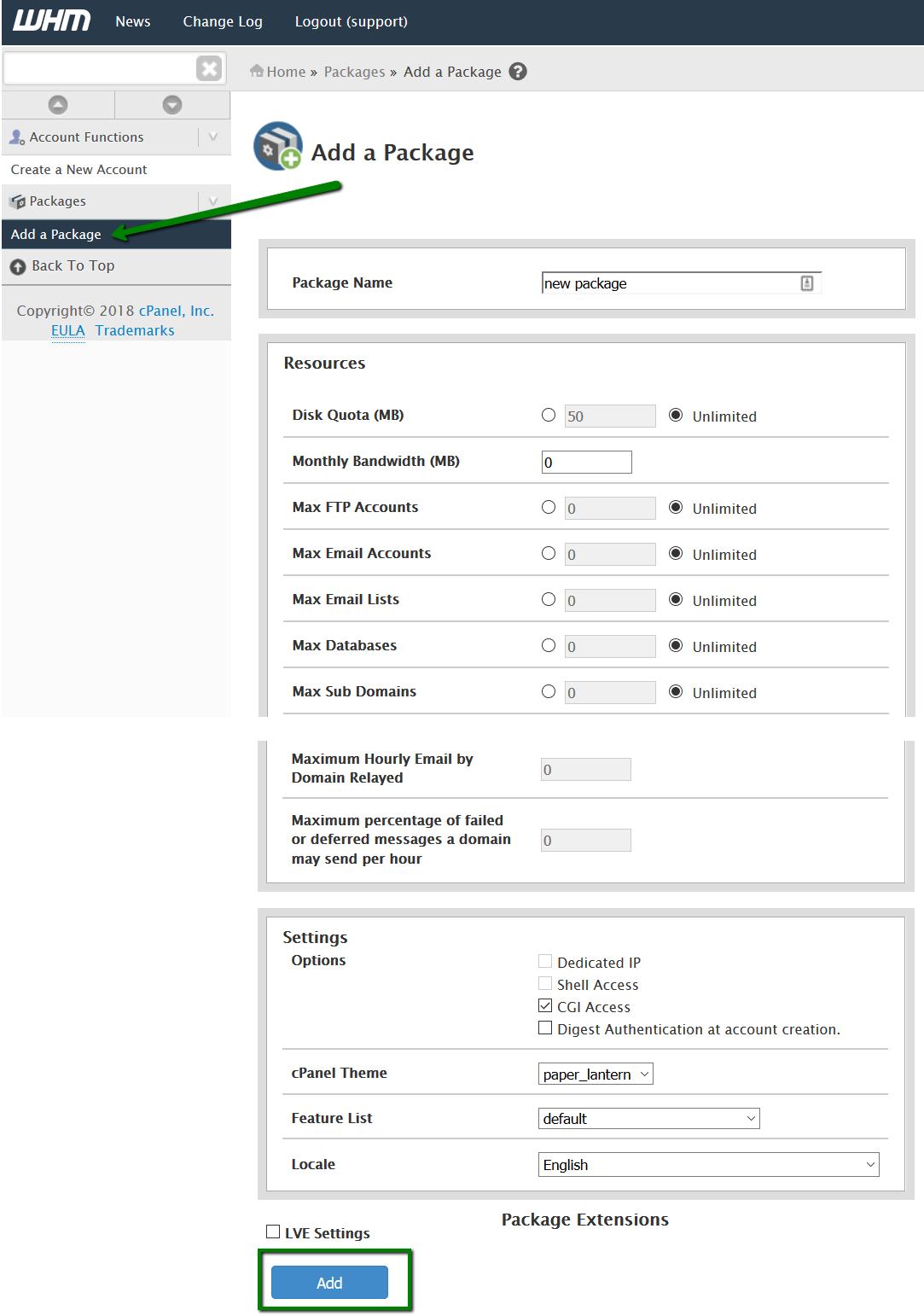 A hosting package is simply a set of functions, limitations and resources each cPanel account may have within a Reseller Hosting Account.