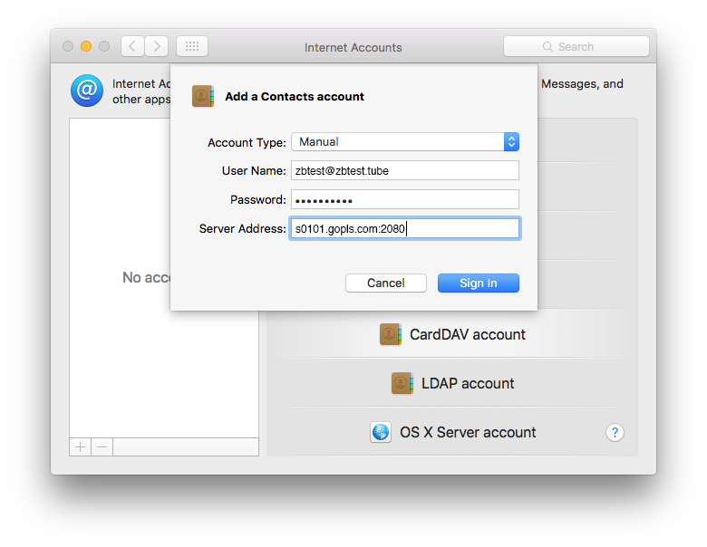 1. Select Add a CardDAV account and click Create.... Use the menu to select Manual: