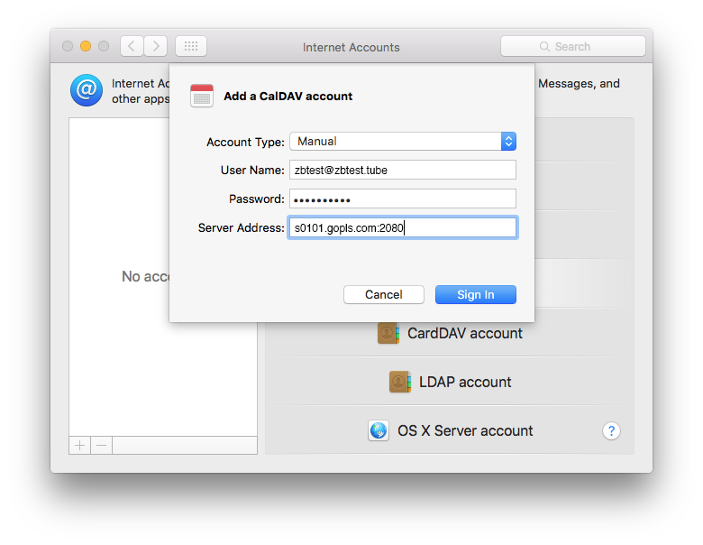 Click Sign In, choose what exactly you would like to use CalDAV with and click Save.