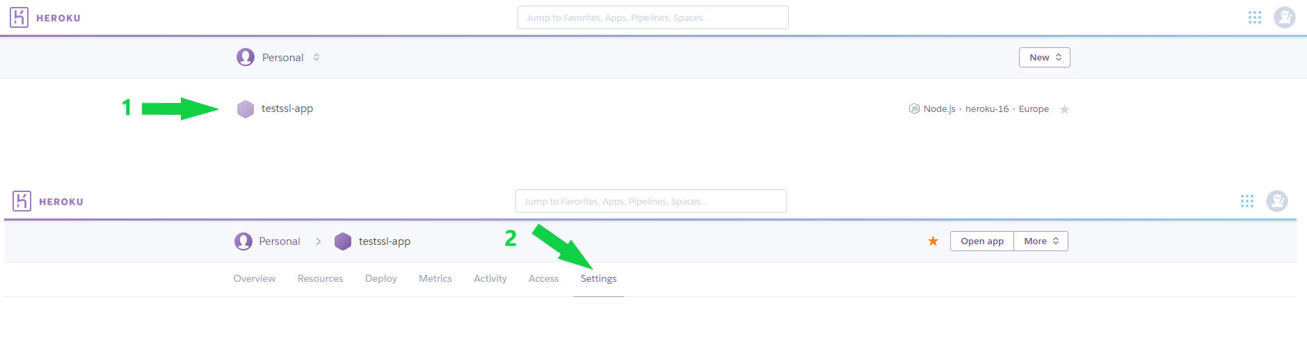 To install the certificate in your Heroku Dashboard, open the certificate, select the necessary application from the list, and select the 'Settings' tab.
