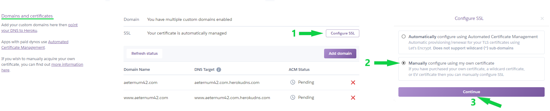 For command line, only one thing will differ: you will need to use the heroku certs:update command instead of heroku certs:add, so it will look like: heroku certs:update server.crt server.key.