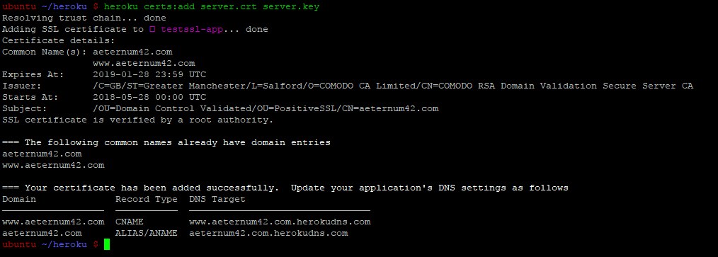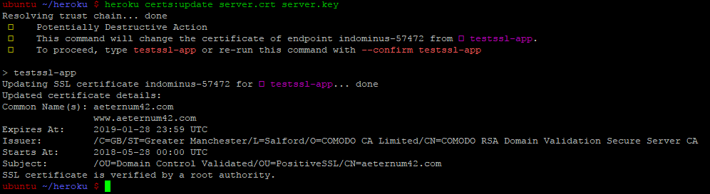 Please note that you may get an 'Internal server error' when adding your certificate. The reason may be that you are using an outdated version of the Heroku CLI. In this case, you can check your CLI installation and update it to the latest version with the heroku update command or reinstall the CLI itself.