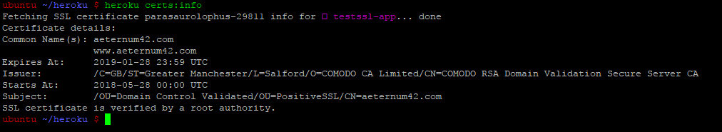 To check if the correct certificate is installed at the moment, you can run the heroku certs:info command.