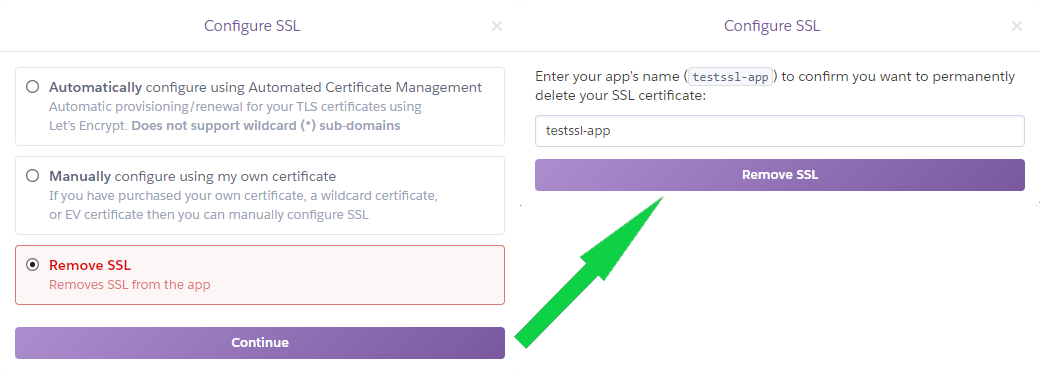 If you need to remove the certificate, it can be done via the same menu. Just navigate to 'Domains and certificates' > click on 'Configure SSL' > select 'Remove' > click on 'Continue' > enter the name of your app and click 'Remove SSL'.