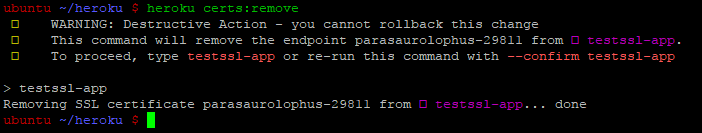 To remove the certificate using the command line, simply run the command heroku certs:remove and enter the app name for confirmation.