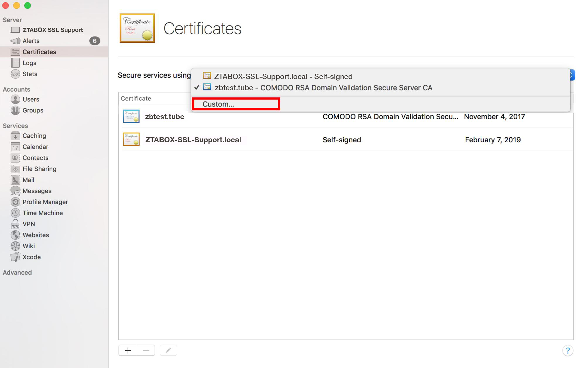 If you want to assign your certificate to custom services (like Mail services, file sharing, etc.), click the corresponding button: