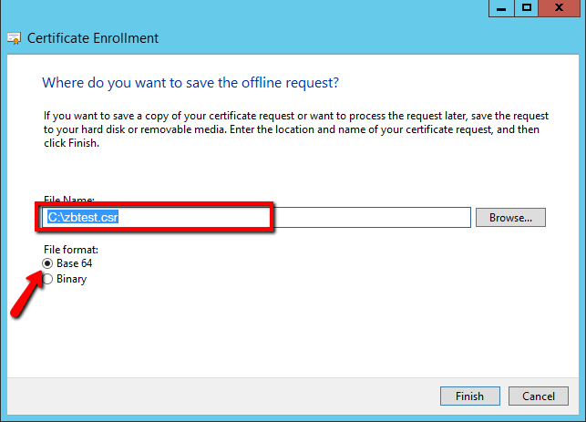 The last screen of the 'Certificate Enrollment' wizard requires us to specify the name of the file the CSR code will be saved into and its location in the file system. Also, make sure that 'File Format' is set to 'Base64'. Then click the 'Finish' button to initiate the private key and CSR generation with the attributes we have set just now: