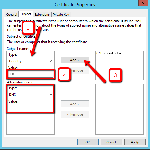Subject = "CN=zbtest.tube, C=HK, O=ZTABOX, L=Hong Kong, S=Hong Kong, Street= Test Avenue 1"