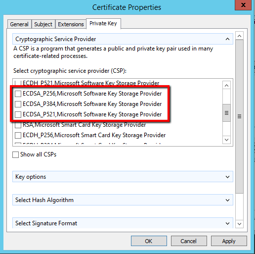 The last tab in this window we should open and review is the 'Private key'. Let's expand the 'Cryptographic Service Provider' section and have a look. The default option here is the 'RSA' algorithm, which is the industry standard today, although you can opt for "ECDSA" (if you need to issue an ECC certificate) by checking one of the entries on the picture below: