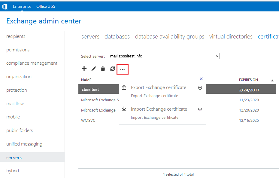 1) To import the certificate click on the same '...' (more) button and select 'Import Exchange Certificate'. In this step, it does not matter which server is selected from the drop-down menu as you will specify it later.