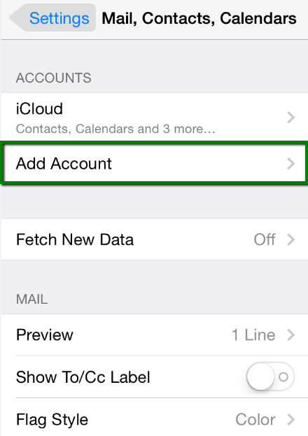 2. Choose Mail, Contacts, Calendars and click on Add Account: