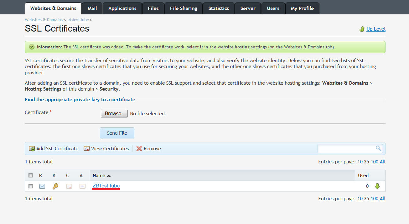 Note: If your Private Key (along with CSR) was not generated on Plesk, click on the Key icon near the domain name in the 'SSL certificates' section and upload the corresponding Key for it. Once done, you can proceed with uploading certificate files as specified in the previous steps.