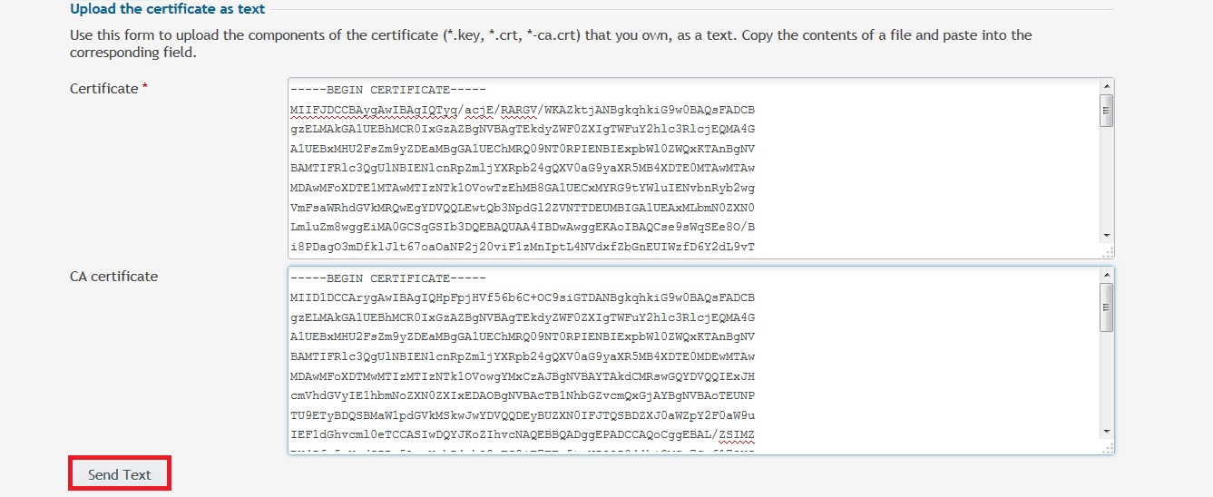 Otherwise, you can copy and paste the certificate along with the CA bundle into the corresponding boxes under Upload the certificate as text and click on 'Send Text'