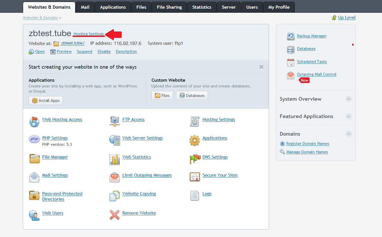 Return to the Websites & Domains tab and click on 'Hosting settings' next to the domain in question.