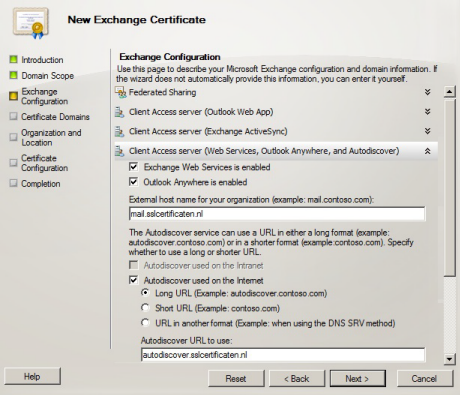 - The next screen allows you to review a list of the names which Exchange 2010 suggests you include in your certificate request. It is not possible to add extra domain names on this page; this has to be done through our application page. Please indicate which domain name you wish to use as Common Name and click Next: