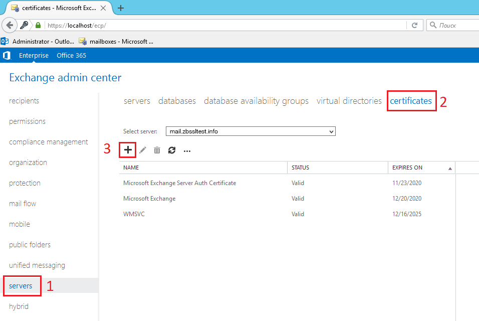 1) First, open your Exchange Administration Center in the web browser (usually done via https://localhost/ecp) and navigate to Servers > Certificates. Then click on the '+' button to open the Exchange certificate wizard.