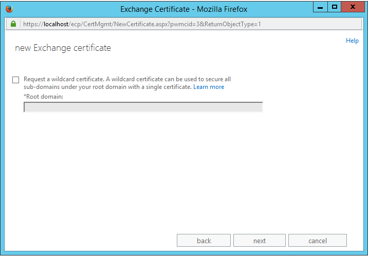 4) In the next step, you will be given the option to create a CSR for a Wildcard domain. Although Wildcard certificates are accepted and supported by Exchange 2013, they are not recommended as they may be not compliant with other server products which do not support them. If you are using a multi-domain (aka other names - SAN or UCC) certificate, you can skip this step by clicking Next.