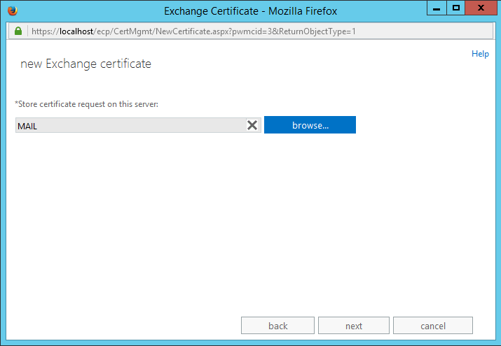 5) Click Browse and select the Exchange server where the pending CSR will be stored on, then click Next.
