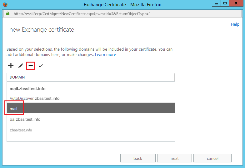 Note: The server internal name is added to the list by the server. Various other names may also appear, depending on how the previous step was completed. Due to the restrictions of CA/Browser forum, the Certificate Authorities do not issue certificates for internal/local domain names. Remove the internal domain name from the list using the '-' button.