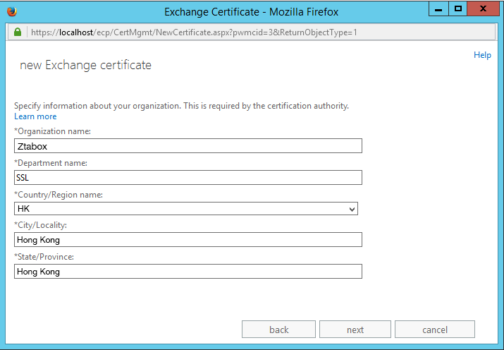 • Organization name: the name of your company. If the certificate is not being used for a company or organization, you may enter 'NA'. In most cases, domain-validated certificates are sufficient for the Exchange server so this will not cause any issues.