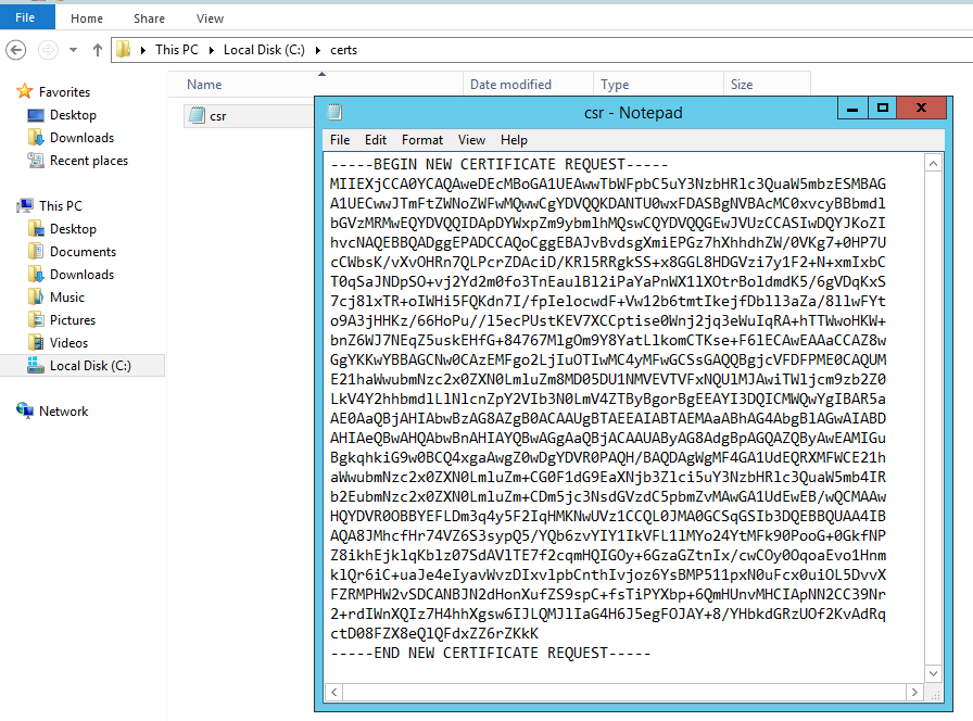 10) Enter a path to the folder on your computer in which the CSR will be saved. In this example, the file will be saved in the 'certs' folder on the disk C://. Note: the destination folder should be created in advance. The system offers to save the file with .req extensions, however you will need only its text, so you are free to use .txt extension.