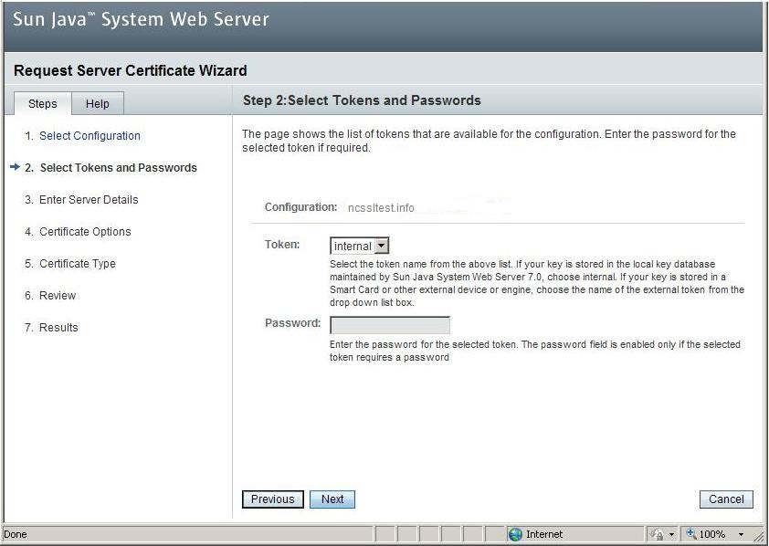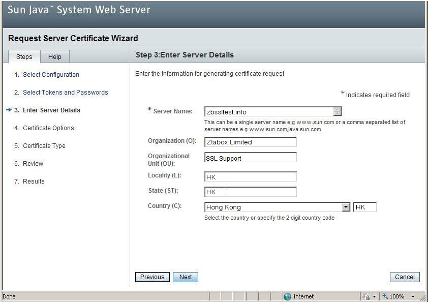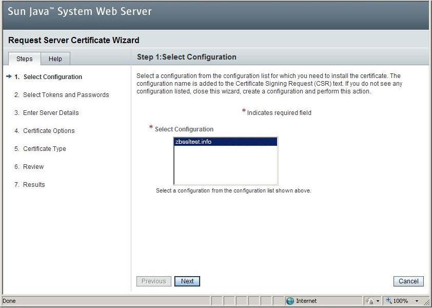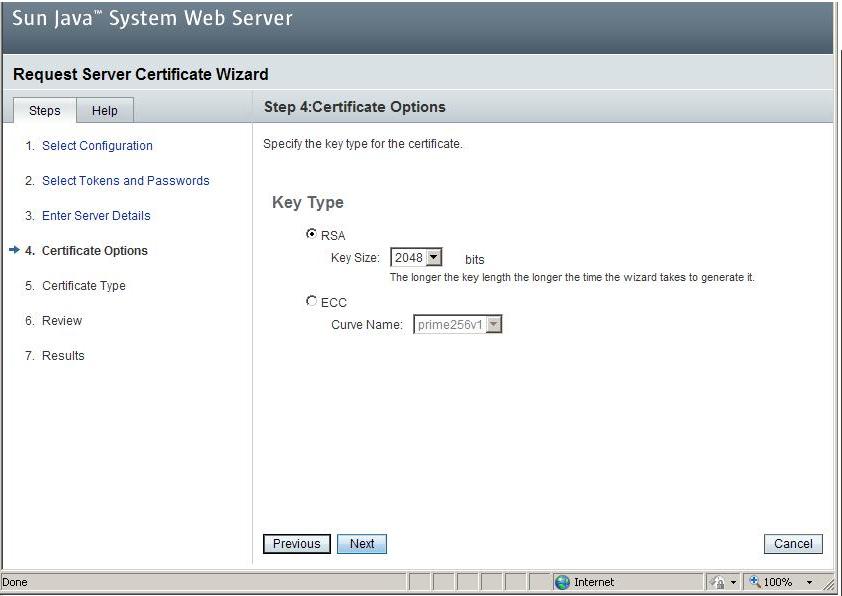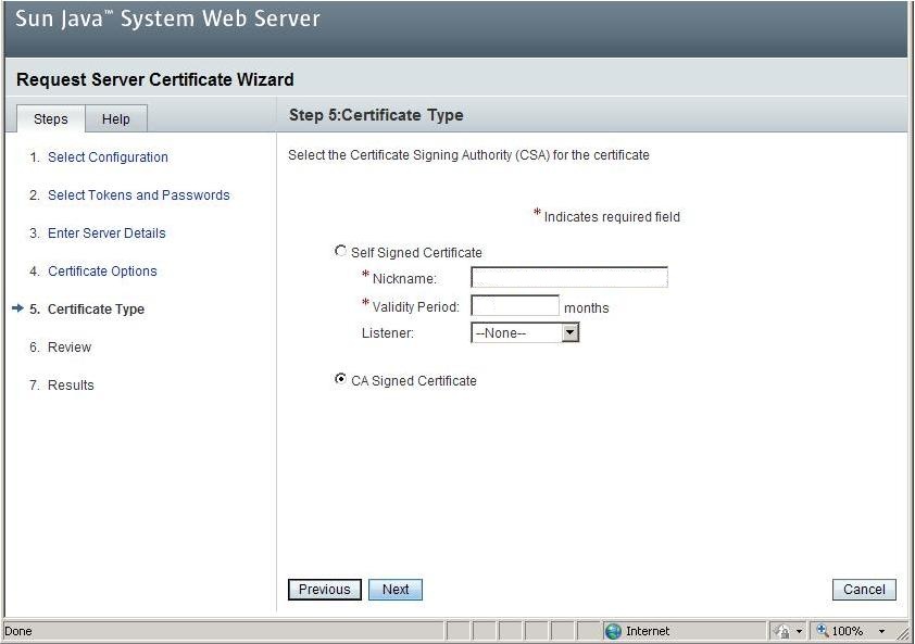 To generate CSR via the Sun Java System WebServer certificate wizard, follow the steps below: