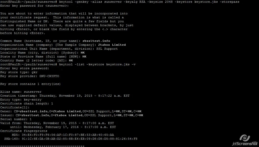 - Keytool will ask you the information needed for CSR generation. Fill the needed information like it was explained earlier and the key will be created along with the entered data.