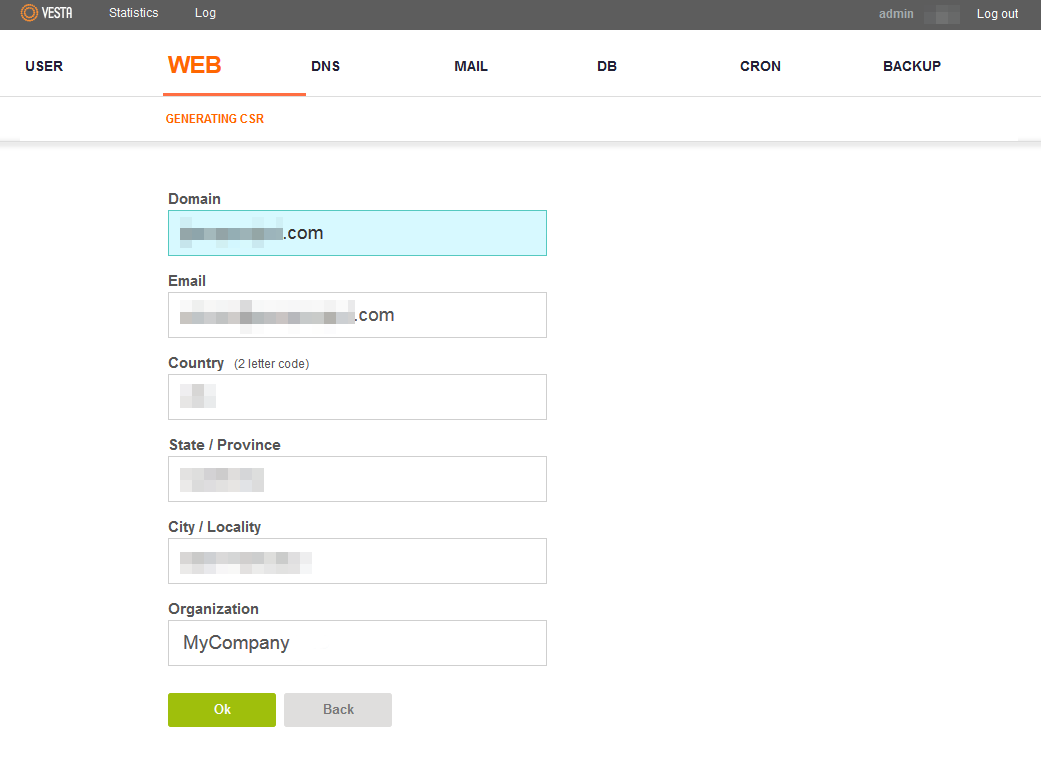 Please keep in mind that there should be only alphanumerical symbols in the CSR.Once everything is filled in, click 'Ok'.