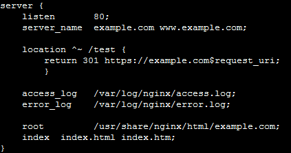 This rule defines that the redirect is applied only for the files located inside the 'test' directory and the directory itself. It is also possible to redirect several folders by creating corresponding 'location' blocks for each of them.